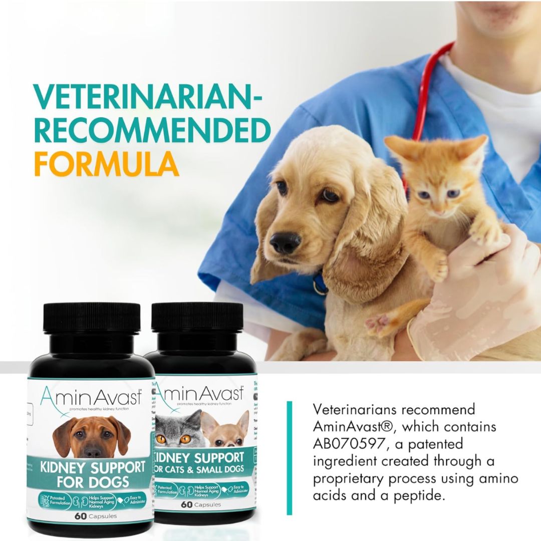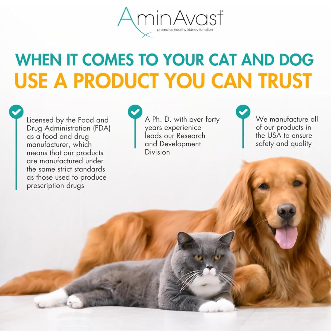 AminAvast is a veterinarian-recommended nutritional supplement designed to support healthy kidney function in cats and dogs. Its proprietary blend of amino acids and peptides helps maintain normal renal health and overall vitality. Safe for both short-term and long-term use, with no reported side effects.