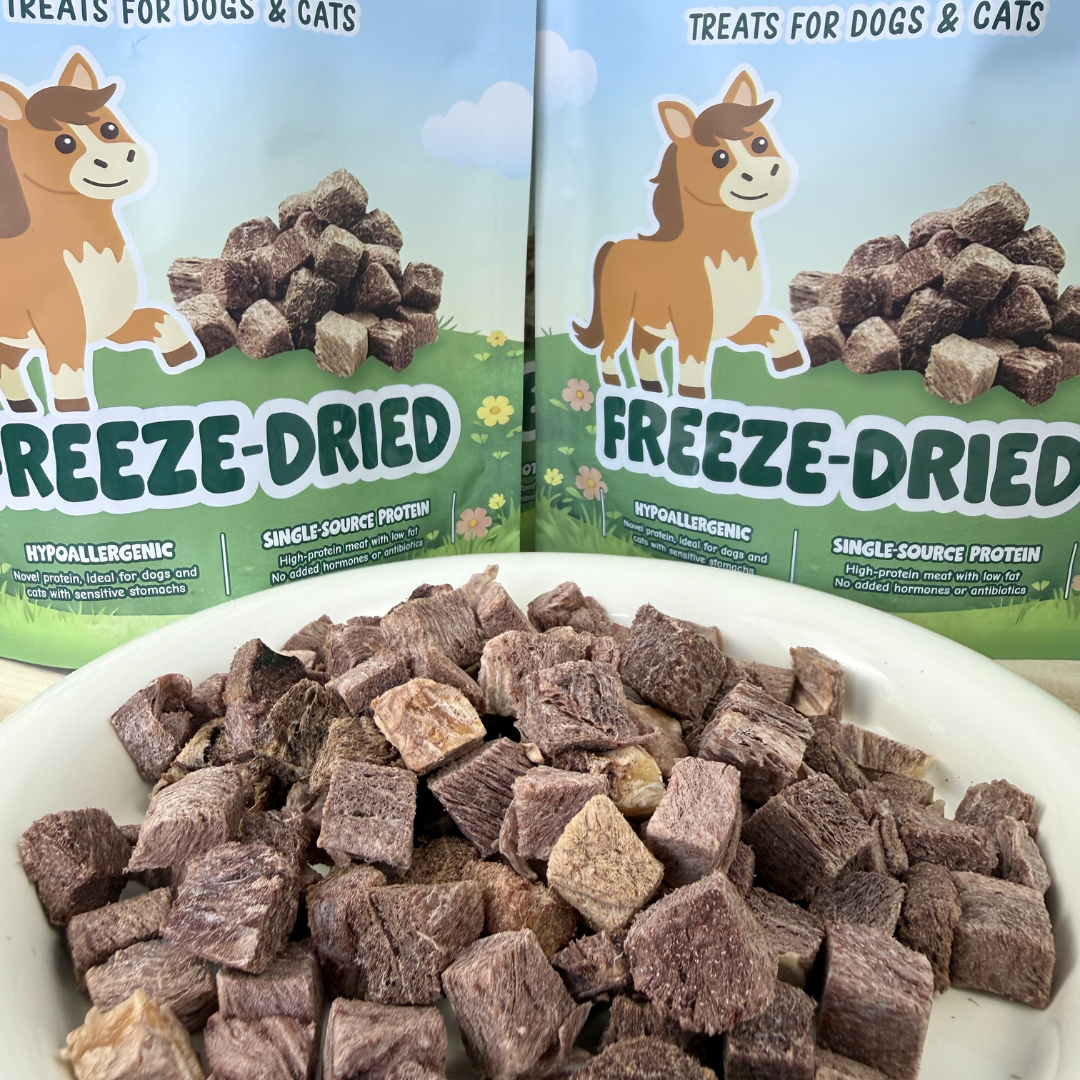Our Freeze-Dried Horse treats are made from 100% raw Australian horse meat, offering a lean and highly digestible protein source for dogs and cats. Horse meat is considered a novel protein, making it an excellent option for pets with food sensitivities.