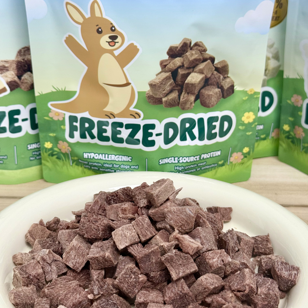 Made from 100% raw Australian kangaroo meat, our Freeze-Dried Kangaroo treats are a lean, nutrient-dense option for dogs and cats. Kangaroo is a novel hypoallergenic protein, making it a smart choice for pets with allergies or sensitive digestion.