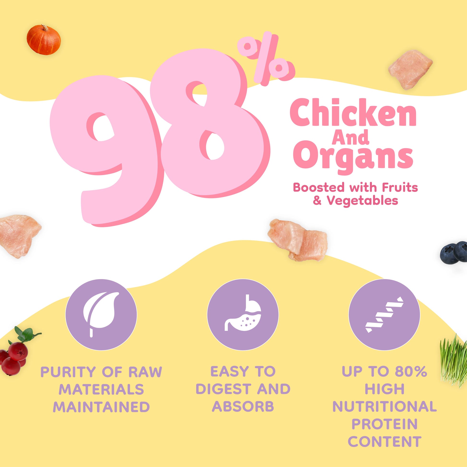 Ingredients: Chicken 86%, Chicken Liver 12%, Pumpkin Powder 1%, Yam Powder 0.7%, Cellulose 0.28%