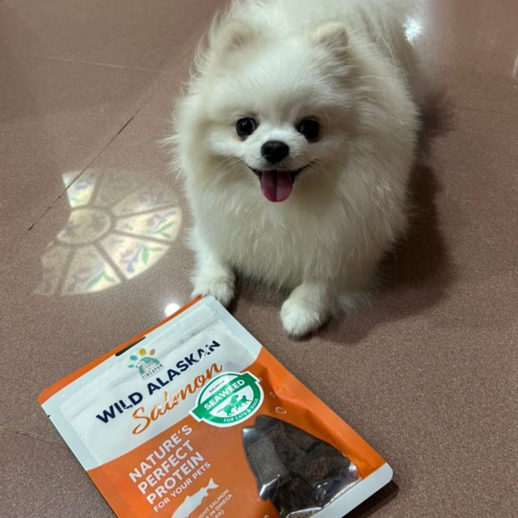 Ingredients: Wild Alaskan Salmon 70%, Seaweed 29.8%, Preservative (Potassium Sorbate), Antioxidant 0.2%